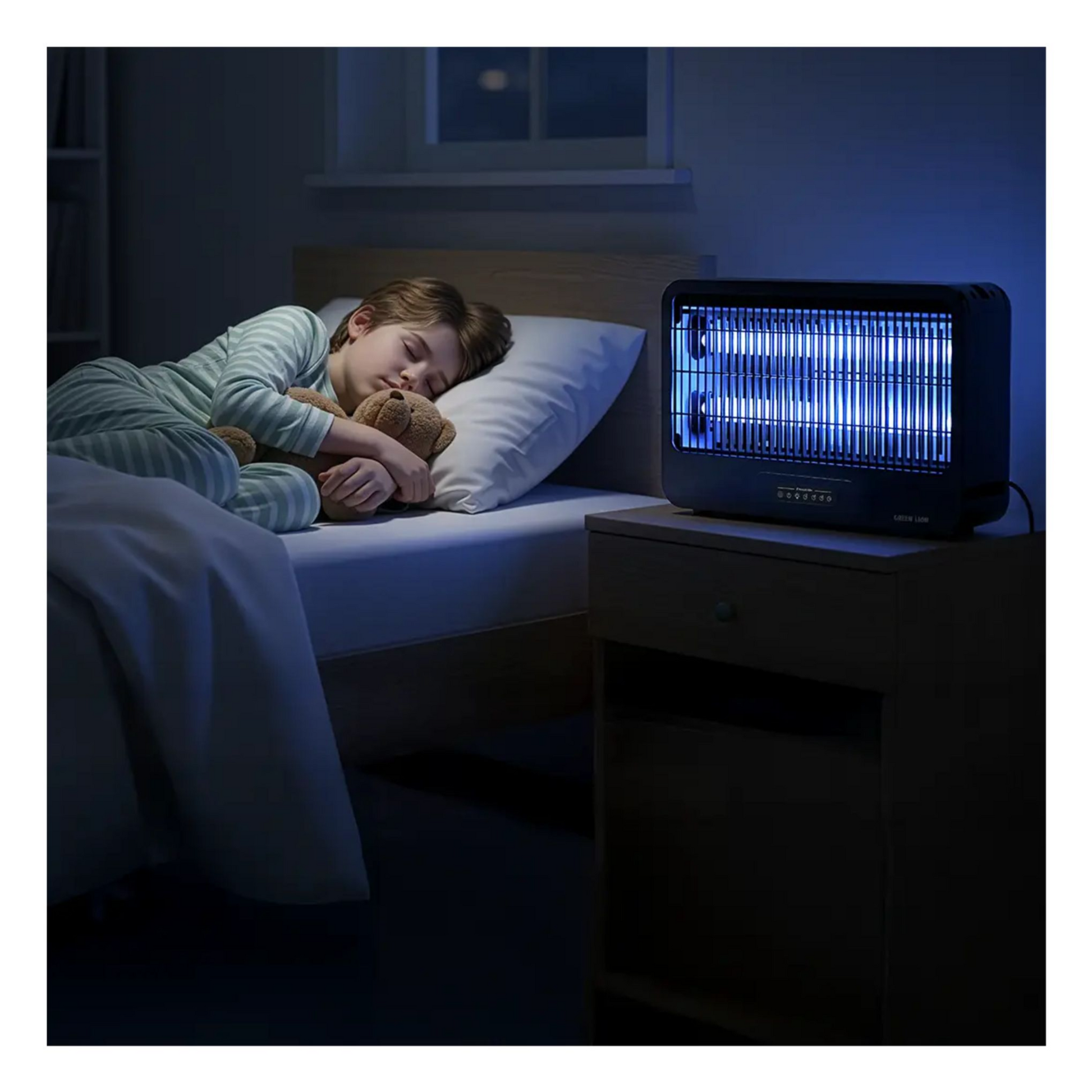 The Green Lion Barq Insect Killer is an efficient mosquito and flying insect trap designed for homes and offices. It uses a 365nm UV light to attract insects and a high-voltage electric grid (3200–3500V) to eliminate them instantly. With 100m² coverage, it can be used on a tabletop or hung on a wall for flexible placement. The device features low-noise operation, child-safe protective grille, easy-clean tray, and timer settings (2/4/8 hours) with IR remote control for convenient use. Durable ABS and steel construction ensures long-lasting performance.
