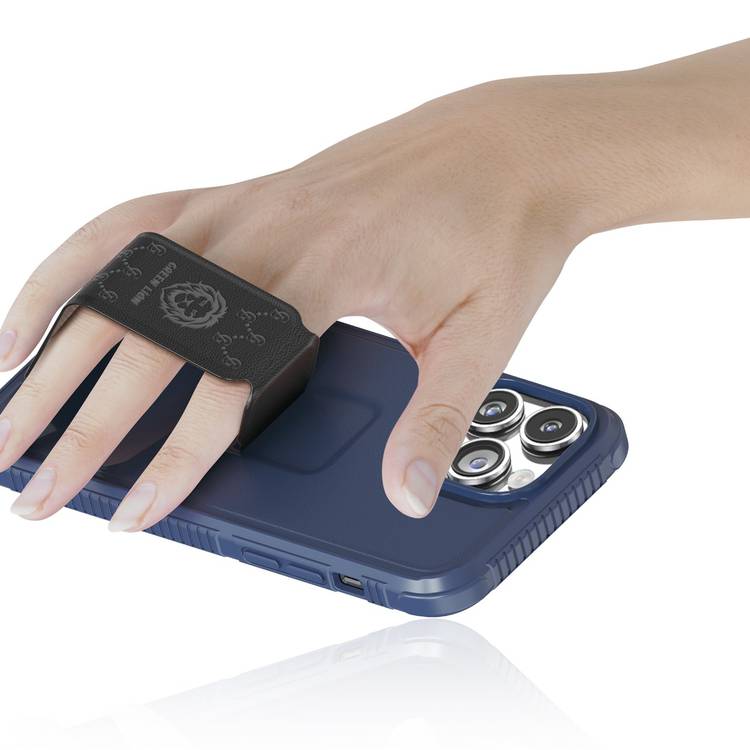 Green Lion Protective Case With Band Stand For iPhone 14 plus offers reliable shock absorption , a slim design, and an anti-slip surface for secure handling , made with polycarbonate materials .